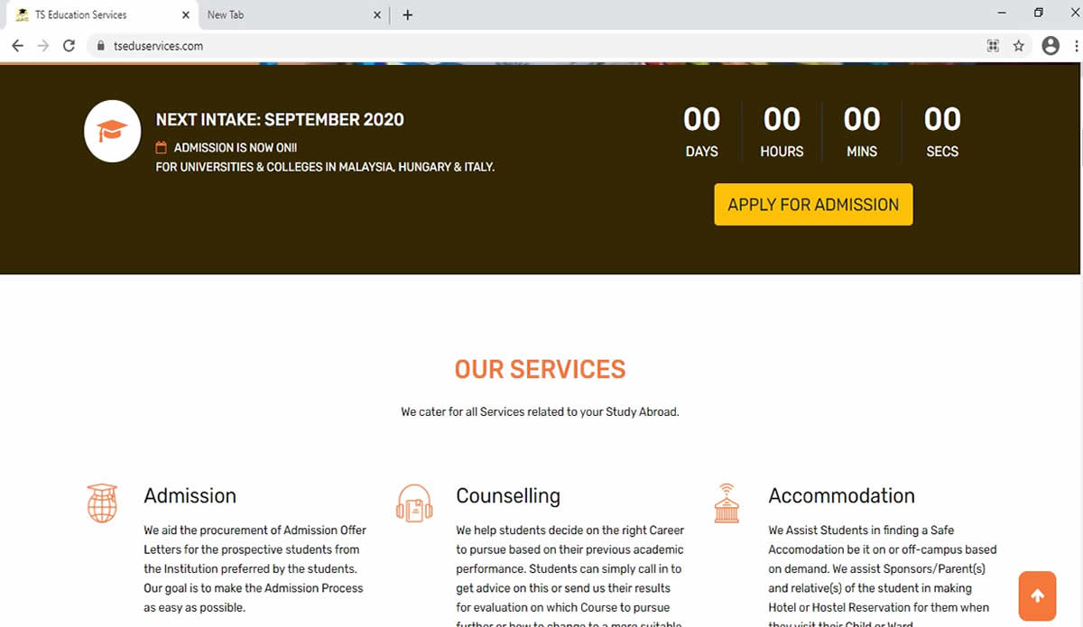The client was a Study Abroad Agency, there Website was Old and slow so, they urgently needed an Upgrade. It tooks us Two(2) Weeks to complete and TS Education Services Website was completely re-designed by March, 2019. Based on the Client request, the Website has numerous features such as: